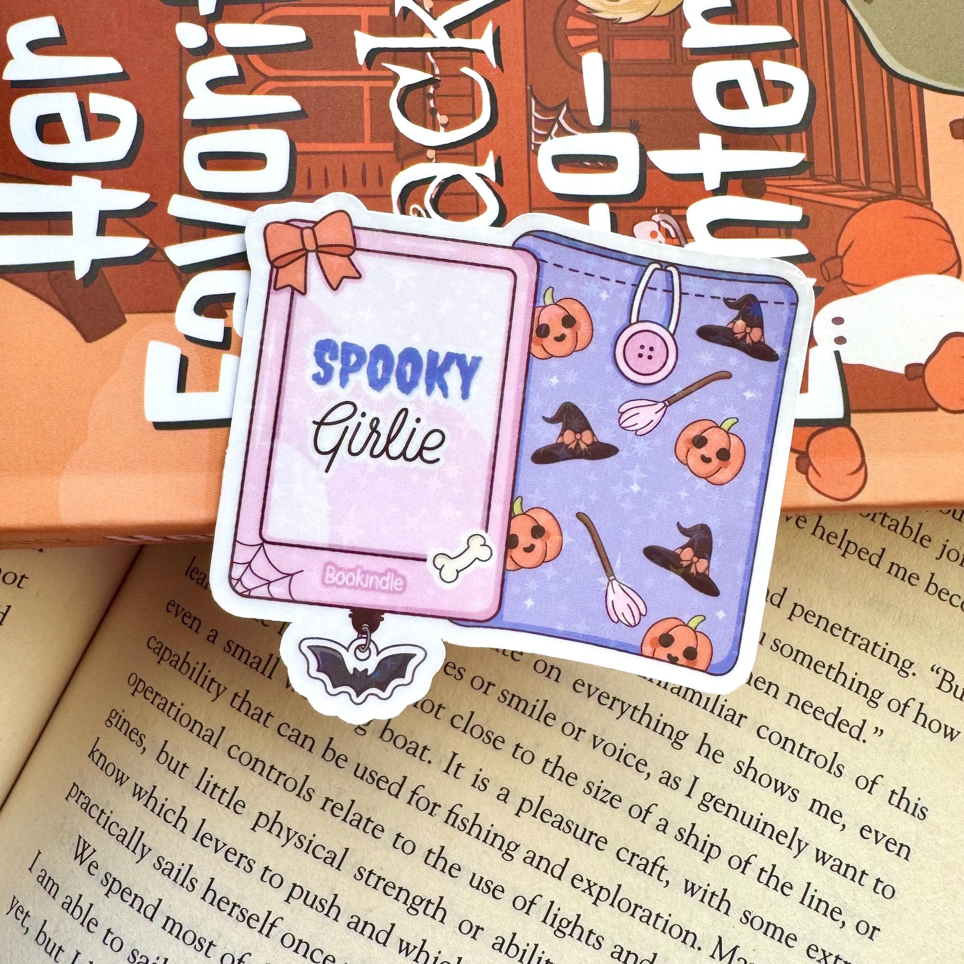 Spooky Girlie Kindle Case holographic bookish sticker - perfect for adding a touch of literary charm to your Kindle, notebooks, laptops, water bottles, TBR carts, and more! This cute and sparkly sticker is the perfect accessory for all book lovers and reading enthusiasts! ♡